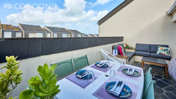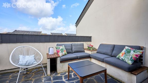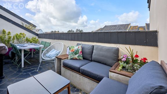 - Une terrasse de 14 m² exposée Sud-ouest avec un salon d'angle et un espace repas pour profiter des beaux jours