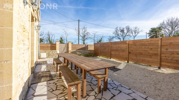 - Une première terrasse clôturée et exposée sud disposant de deux grandes tables et bancs pouvant accueillir 16 personnes. Une seconde terrasse à l'avant de la maison exposée ouest équipée de tables et mobilier de jardin.