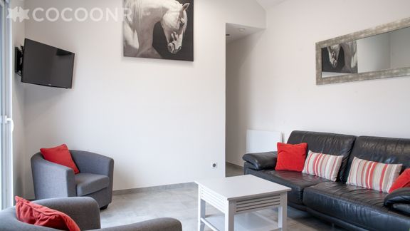 - Une pièce de vie de 23 m² avec TV, canapé, espace repas...
