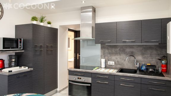- Une cuisine équipée avec notamment : bouilloire électrique, four, four à micro-ondes, grille-pain, plaques de cuisson...
