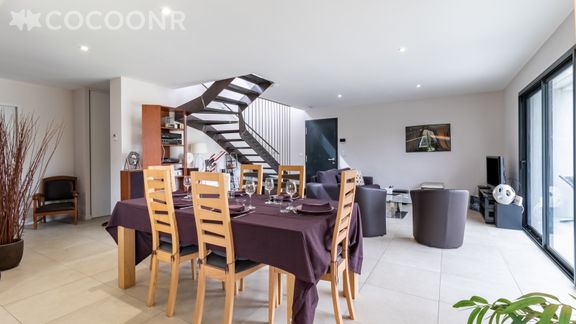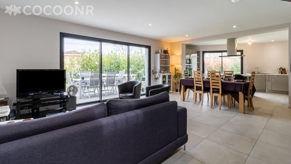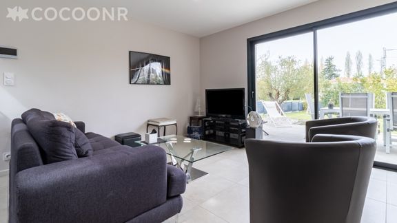 - Une pièce de vie lumineuse de 34 m² avec TV, canapé, fauteuil et espace salle à manger.