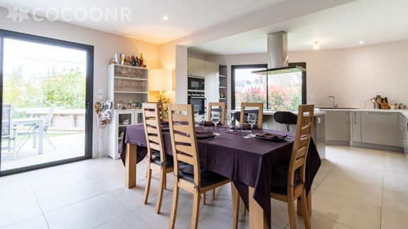 - Une cuisine ouverte équipée : îlot central, bouilloire électrique, grille-pain, four à micro-ondes, four, plaques de cuisson, lave-vaisselle, machine à espresso, vaisselle et couverts...
