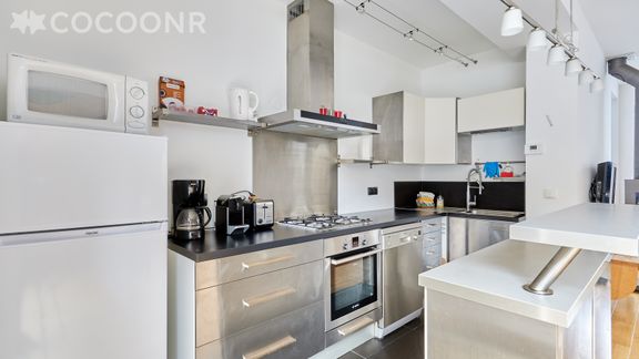 - Une cuisine ouverte, équipée avec notamment : bouilloire électrique, four, four à micro-ondes, grille-pain, lave-vaisselle, plaques de cuisson...