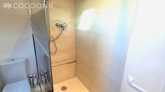 - Une salle d'eau avec une douche, une vasque, des rangements, un sèche-cheveux et un WC.
