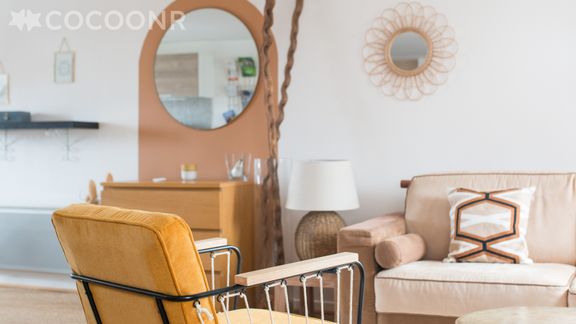 - Une grande pièce de vie traversante est-ouest avec un espace salon cosy disposant d'un canapé, de deux fauteuils et d'une table basse, un espace repas avec une table à manger pouvant accueillir jusqu’à 4 convives et une grande TV écran plat.