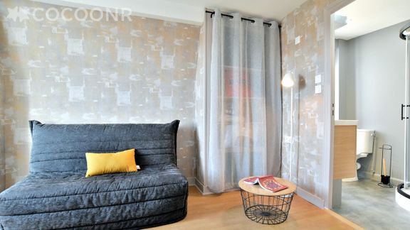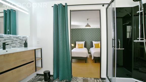 - Chambre 2 : un lit queen-size (160×200), un canapé lit (140x190) et un espace de travail, salle d'eau attenante avec douche, un meuble vasque et WC