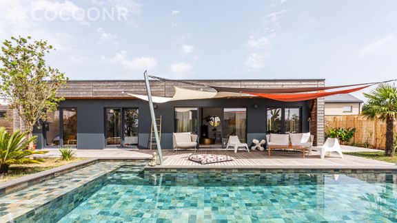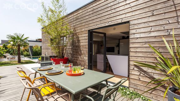Nous vous proposons à la location, sur la commune Dinan, cette charmante maison en bois contemporaine avec piscine, d’une superficie de 120 m² et pouvant accueillir jusqu’à 6 voyageurs. Elle est composée d’une jolie pièce à vivre de 55 m², d'une cuisine équipée, de trois belles chambres, une salle d'eau et vous pourrez profiter d’un jardin aux allures exotiques d’environ 450 m² ainsi que de deux terrasses idéal pour profiter de repas entre amis ou en famille. Wifi, draps et serviettes inclus, nous n’attendons plus que vous !