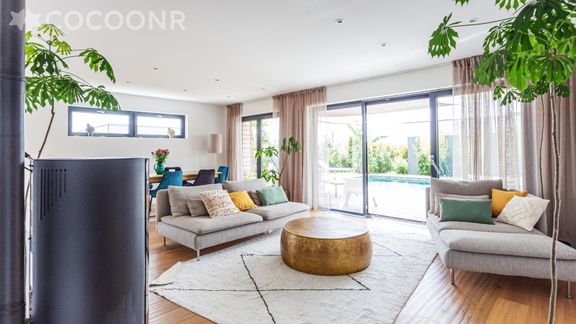 - Une pièce de vie exposée Sud de 55 m² avec TV, canapés et espace repas.