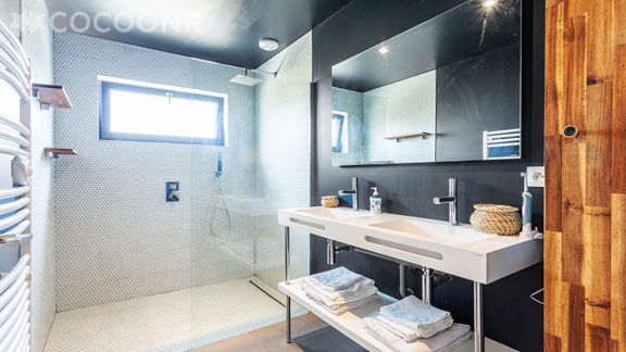 - Une salle d'eau avec douche à l'italienne et double vasque suspendue.