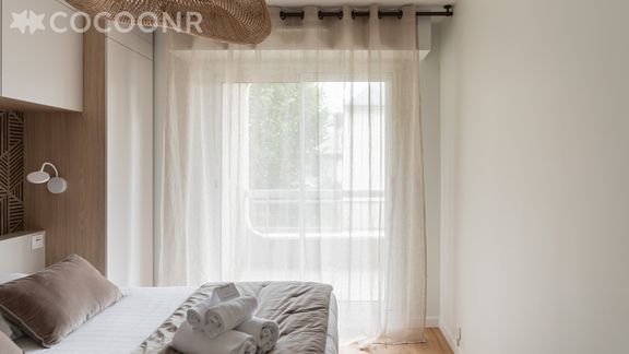 - Une chambre avec un lit queen-size (160*200). La literie est de qualité premium (matelas de 25 cm d’épaisseur). Des prises USB murales sont installées de chaque côté du lit. Accès direct au balcon.