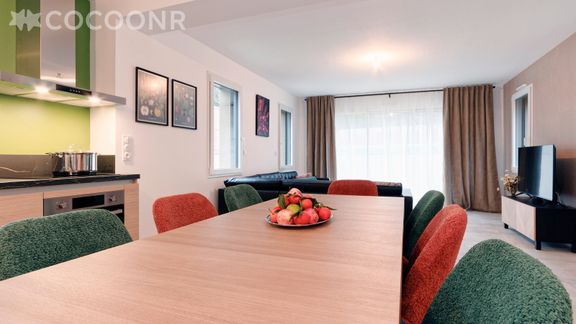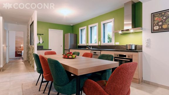 - Une cuisine équipée avec notamment : bouilloire électrique, four, four à micro-ondes, grille-pain, lave-vaisselle, plaques de cuisson...