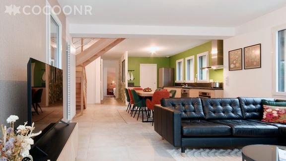 - Une pièce de vie de 42 m² avec un espace salon (canapés, TV) et un espace repas