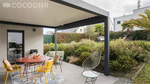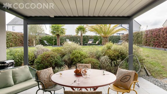 Une terrasse abritée par une pergola bioclimatiques équipée de mobilier de jardin “Fermob”, confortable et élégant. Il y a à votre disposition une plancha électrique.