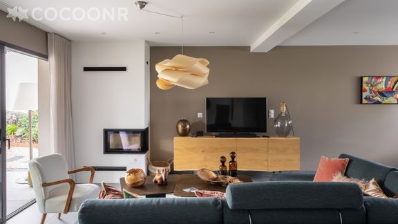 - Une superbe pièce de vie de 70 m² avec canapé confortable pouvant accueillir les 6 convives, TV connectée, un coin détente agrémenté de deux fauteuils club. Accès direct à la terrasse et au jardin. La cheminée n’est pas utilisable.