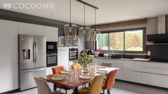 - La cuisine ouverte sur le salon/séjour est entièrement équipée et spacieuse. Amateur de cuisine ou de pâtisserie, vous pourrez profiter de nombreux éléments de cuisine mis à disposition afin de préparer vos plus beaux menus ! Il y a notamment : une bouilloire électrique, une machine à café à grain ainsi qu’une machine à café Senseo, un grille-pain, lave-vaisselle, plaque de cuisson à induction (3 feux), four et four à micro-ondes, un frigidaire américain, une cave à vin…