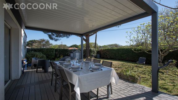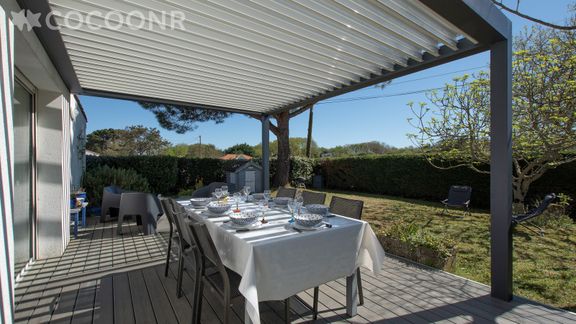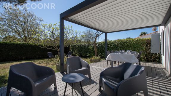 - Une terrasse en bois de 25 m², exposée sud, avec mobilier et pergola bioclimatique pour profiter des beaux jours.