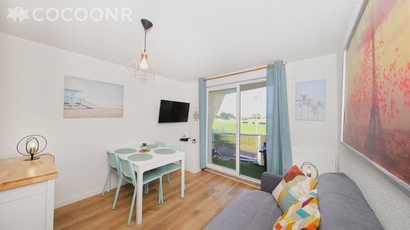 - Une pièce de vie de 15 m² avec canapé-lit double, TV et coin repas