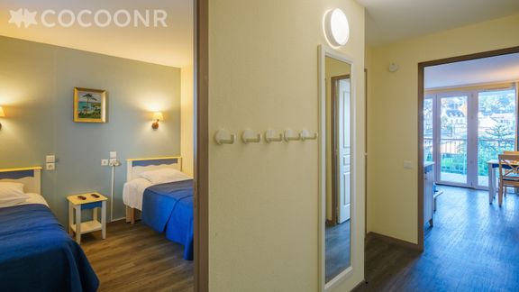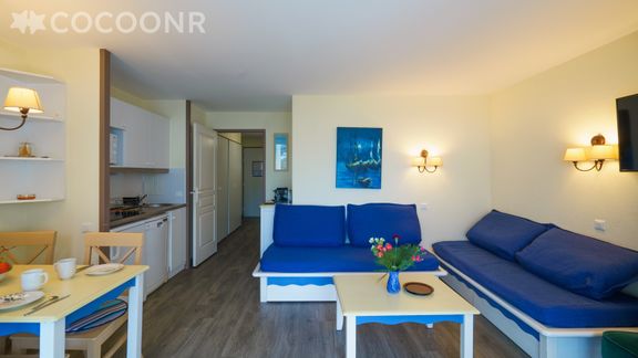 - Une pièce de vie de 18 m² avec deux banquettes lit pour 1 personne chacune, TV, coin repas et grande baie vitrée donnant sur le balcon avec vue sur mer et piscine partagée