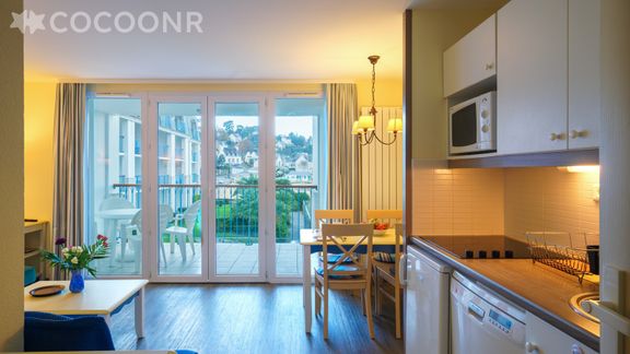 L'Agence Cocoonr/Book&Pay vous propose à la location, sur la commune de Douarnenez, cet appartement avec vue mer, plage au pied de la résidence (accès direct sans route à traverser) , avec piscine partagée, d’une superficie de 38 m² et pouvant accueillir jusqu’à 4 voyageurs. Situé au 1er étage (avec ascenseur), il se compose d’une pièce à vivre de 18 m², kitchenette équipée, d’une chambre, une salle de bain (avec baignoire) et vous pourrez profiter d’un jardin partagé d’environ 5 000 m².