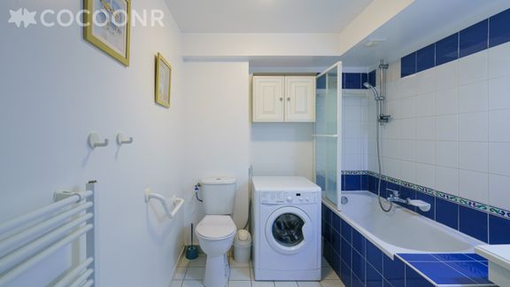 - Une salle de bain avec baignoire, WC, meuble vasque, machine à laver et placard de rangement
