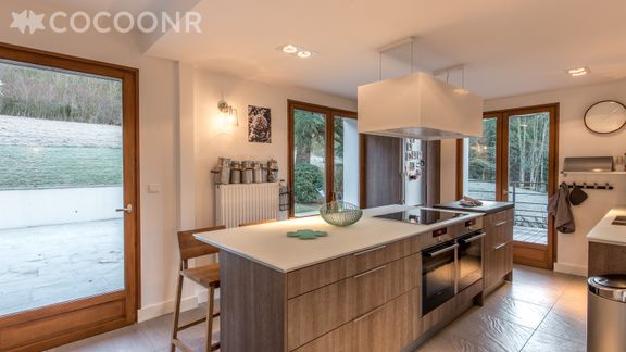 - Spacieuse pièce à vivre ouverte sur une cuisine toute équipée : plaques induction, 2 fours, hotte, lave-vaisselle, micro-onde, frigo-congélateur avec production de glaçon intégrée, cafetière Nespresso, Robot multifonction, machine Soda Stream, grille-pain, robot, bouilloire