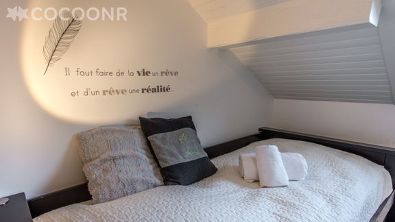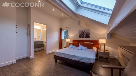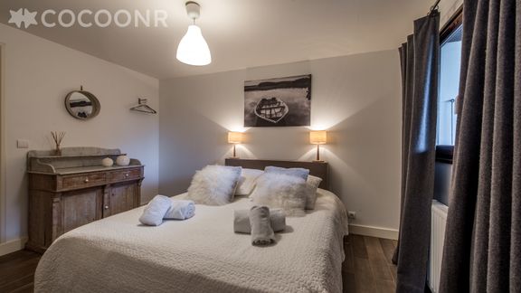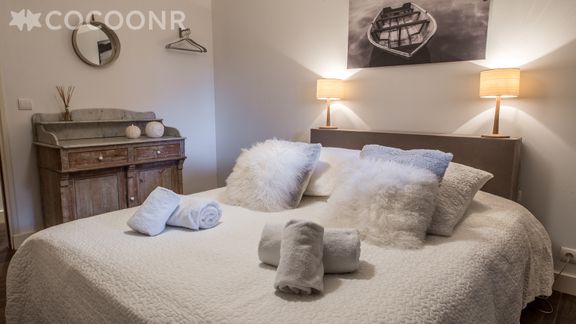- 1 chambre avec 1 lit queen-size (160x200cm) avec commode, porte-manteau, dépose valises.