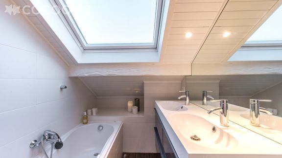 - 1 salle de bains avec double vasque, douche et baignoire