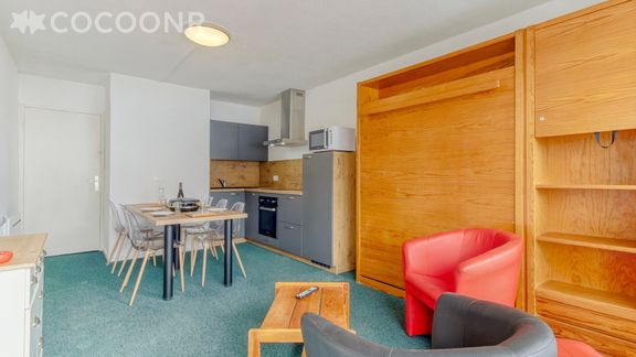 Situé au pied des pistes, vous serez à seulement 100 mètres des commerces et des remontées mécaniques. L'appartement se trouve au 5ème étage avec ascenseur, et peut accueillir confortablement 6 voyageurs. L'appartement se compose d'une alcôve avec lits superposés 140 x 190 cm, d'une pièce de vie avec lit double escamotable, d'une cuisine équipée ainsi que d'une salle de bain avec baignoire. Vous profiterez également du balcon privatif avec vue sur les pistes ! Draps et serviettes en supplément. Cave à skis privée.