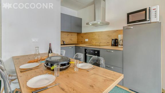 - Kitchenette ouverte et équipée : four, lave-vaisselle, plaques de cuisson, réfrigérateur, micro-ondes, cafetière, grille-pain, bouilloire, appareil à raclette, vaisselle et couverts