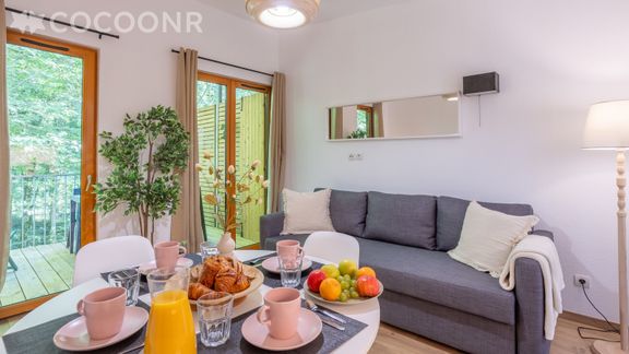 - Une pièce de vie de 15 m² avec TV, un canapé-lit double, un coin repas...