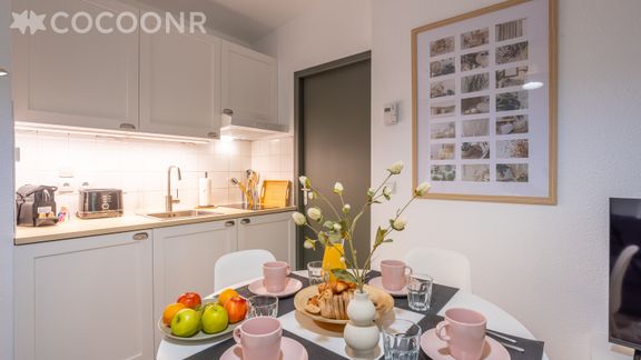 - Une cuisine équipée avec notamment : bouilloire électrique, four à micro-ondes, grille-pain, lave-vaisselle, plaques de cuisson...