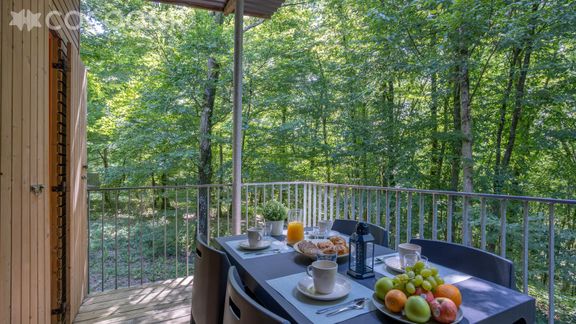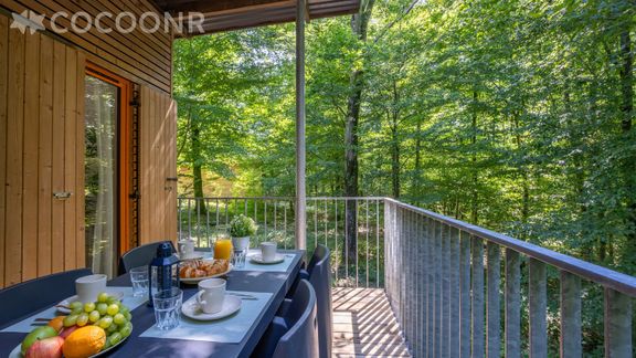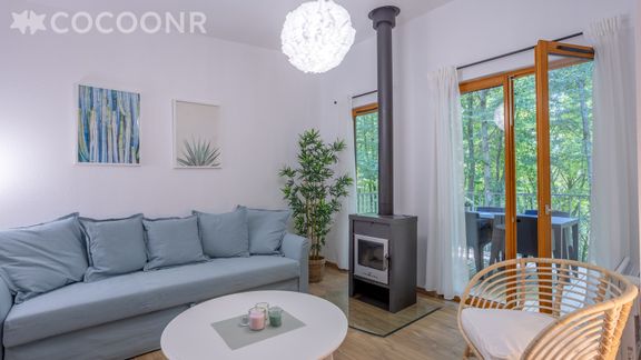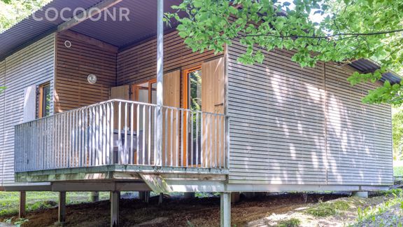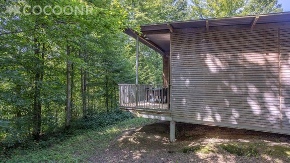 Heel leuk & mooi houten huisje met uitzicht op bos. Je hoort de vogeltjes goed fluiten. Prima huisje qua afmetingen en ruim buitenterras. Woningen ook niet te dicht op elkaar, zodat het boskarakter ook tussen de woningen doorloopt. Parking voor de deur. Meertje en faciliteiten vlakbij en gemakkelijk te voet bereikbaar. Goede restaurantjes. Mogelijk aan het meer om kano te varen, zeer goed uitgewerkt klimparcours in het bos.