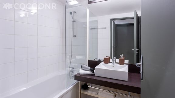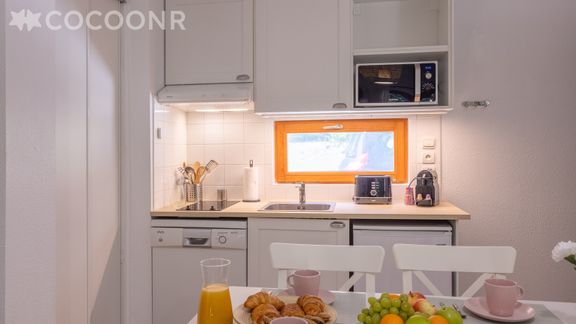- Une cuisine équipée avec notamment : bouilloire électrique, four à micro-ondes, grille-pain, lave-vaisselle, plaques de cuisson...