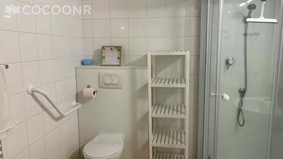 🙁 Le joint au sol censé empêcher que l'eau de la douche avec accès PMR se répande partout ne remplit pas son rôle : on patauge dans la salle de bain. VMC un peu bruyante dans la chambre.