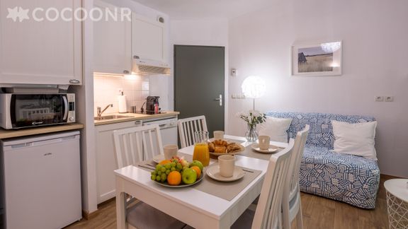 - Une cuisine équipée avec notamment : bouilloire électrique, four à micro-ondes, grille-pain, lave-vaisselle, plaques de cuisson...