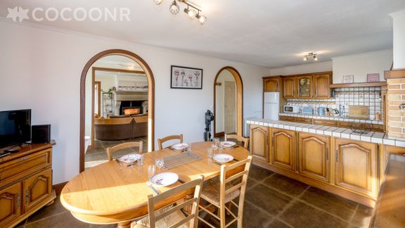 - Une pièce de vie de 100 m² avec TV, cheminée (bois fourni en supplément), canapés