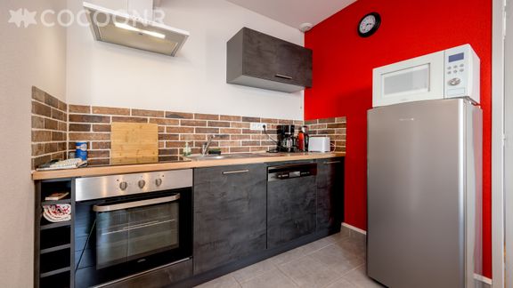 - Une cuisine équipée avec notamment : bouilloire électrique, four, four à micro-ondes, grille-pain, lave-vaisselle, plaques de cuisson...