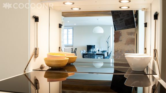- Une cuisine ouverte équipée avec notamment : îlot central, bouilloire électrique, four, four à micro-ondes, grille-pain, lave-vaisselle, plaques de cuisson...