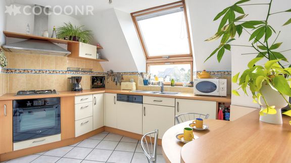 - Une cuisine ouverte équipée avec notamment : bouilloire électrique, four, four à micro-ondes, grille-pain, lave-vaisselle, plaques de cuisson...