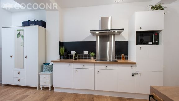 - Une cuisine équipée avec notamment : bouilloire électrique, four à micro-ondes, grille-pain, plaques de cuisson...