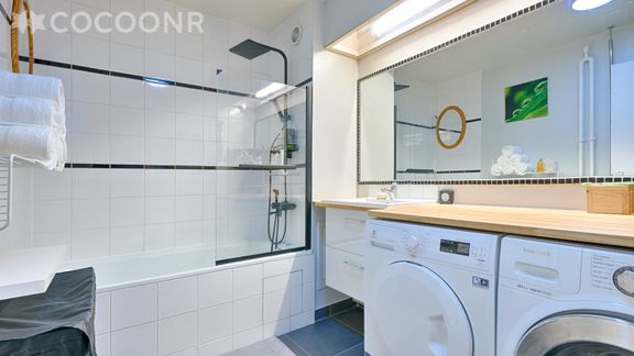 Tout les nécessaire de cuisine, lave linge, sèche linge, chauffe serviette.