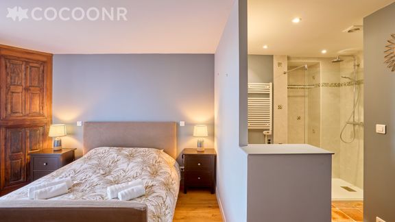 - Un lit queen-size (160×200) et une salle d'eau attenante (avec douche et WC)