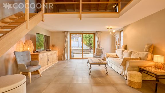 - Une pièce de vie de 40 m² avec TV, canapé et espace repas