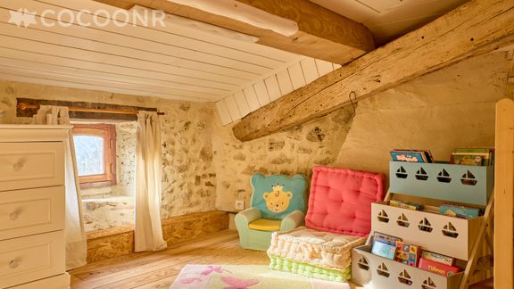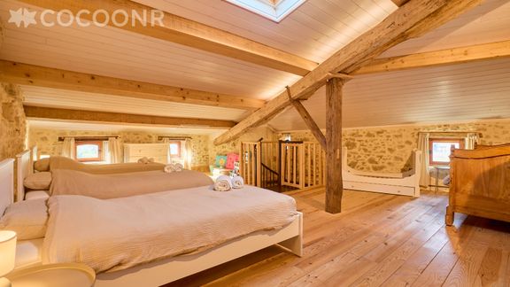 - Un dortoir avec trois lits simples, un petit lit double (130x190) et un lit bébé
