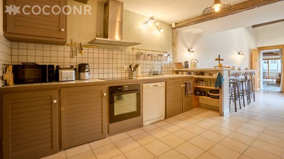 - Une cuisine équipée avec notamment : bouilloire électrique, four, four à micro-ondes, grille-pain, lave-vaisselle, plaques de cuisson...