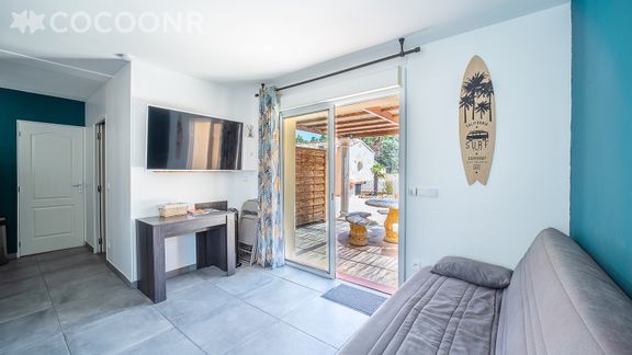 - Une pièce de vie de 18 m² avec canapé-lit double, TV et accès terrasse