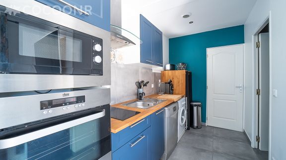 - Une cuisine ouverte équipée avec notamment : bouilloire électrique, four, four à micro-ondes, grille-pain, lave-vaisselle, plaques de cuisson...