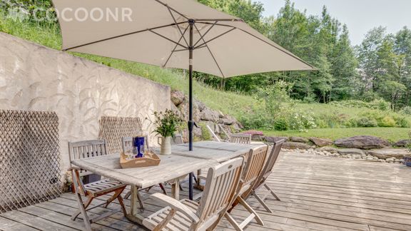 - Grande terrasse en bois de 50 m² exposée sud, prolongée par le jardin, aménagée avec une grande table en bois et ses 7 chaises, parasol, canapé de jardin, fauteuil et petite table.
