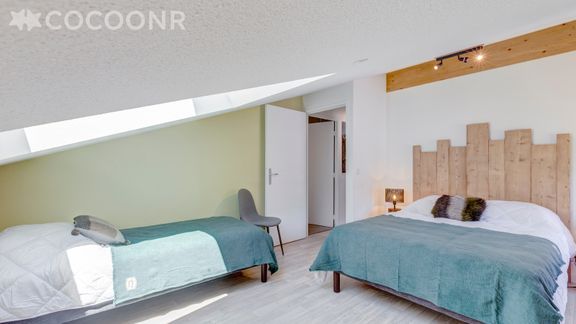 - Chambre 2 spacieuse aménagée d'un lit double (140 cm x 190 cm), un lit simple ainsi que 2 chaises et rangements.