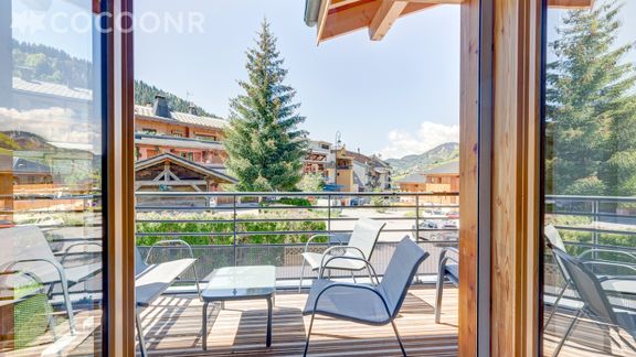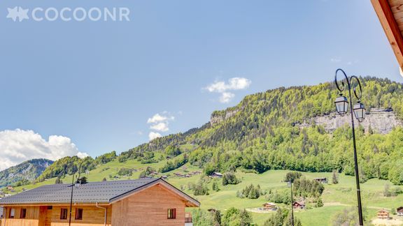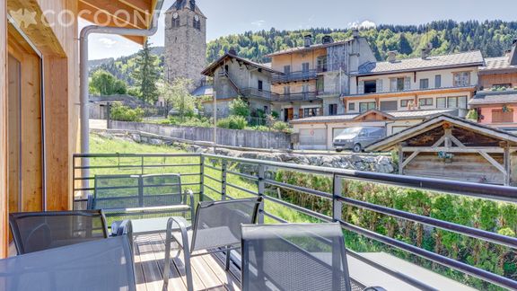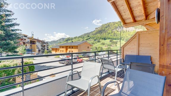 - Le joli balcon aménagé avec une table, un parasol, 2 chaises et un banc, vous offre une vue imprenable sur le village, la végétation ainsi que la montagne.